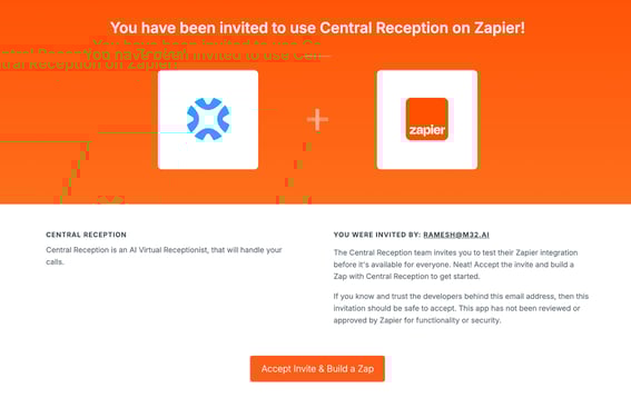 1. Accept our Invitation on zapier.com/developer/public-invite/225535/dca673411b24858a79418d1a5061fe12/ by clicking on “Accept Invite and Build a Zap”
