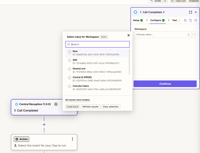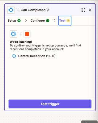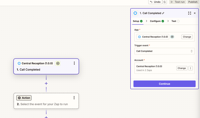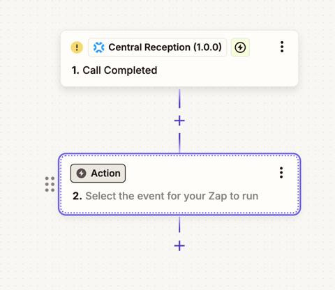 5. Once Central Reception is added, select the trigger event (e.g. “Call Completed”) and connect your Central account to Zapier by authorizing Zapier access to Central.