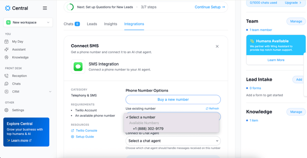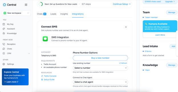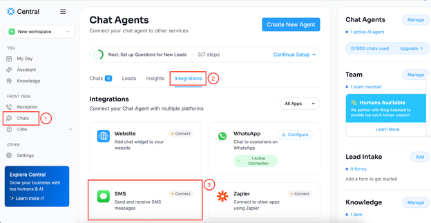Step 1: Within Central, head over to the “Chats” section in the left-hand menu. Then click on “Integrations” > “SMS”