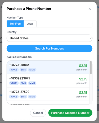 - Click “Search for Numbers” and select your desired phone number