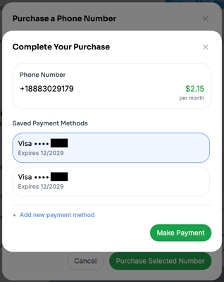 - Click “Purchase Selected Number”, select your payment method, and make the payment