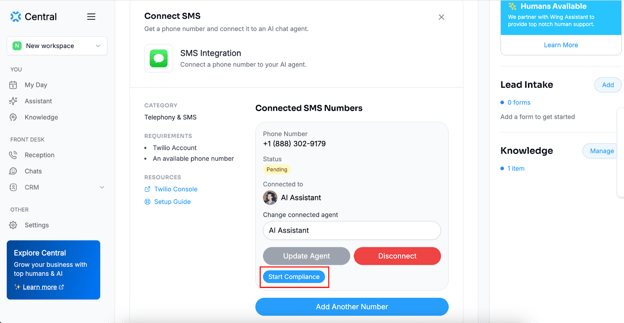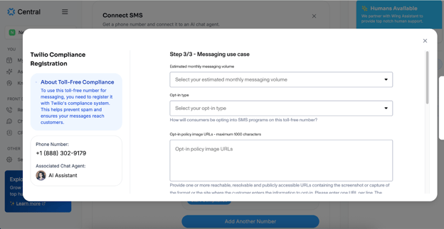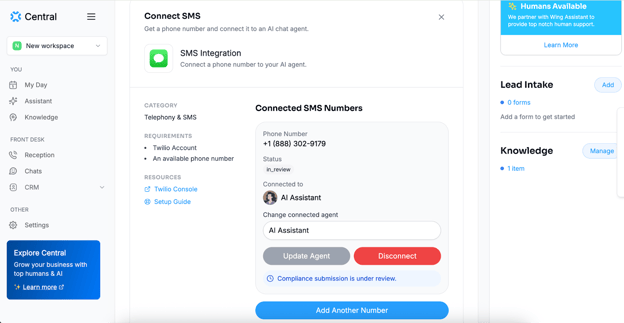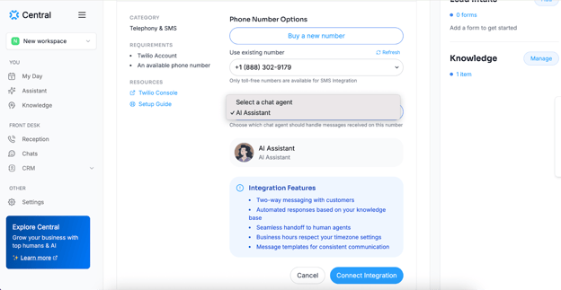 Step 3: Now, you can connect your previously created Chat Agent to this SMS line. If you haven’t already created one, you can create it now.