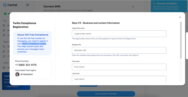 Step 5: Fill in your business information as shown on the screen. This data will be used to register your new Toll-Free number with Twilio's compliance system.