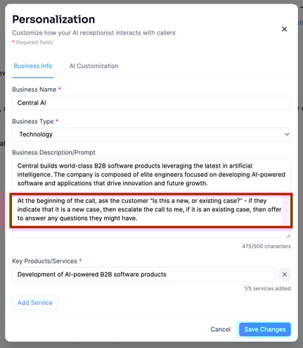 Step 2. Modify the "Business Description/Prompt" field to tell Central AI what you need it to do on every call.