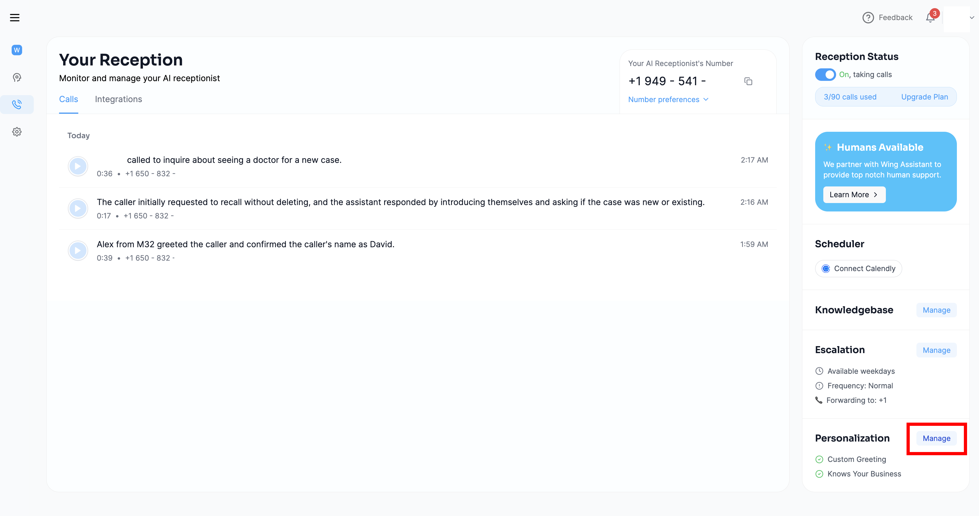 Step 1. Log in to your Central AI Receptionist dashboard. Look for the "Personalization" section in the sidebar, and then tap "Manage" right next to it.
